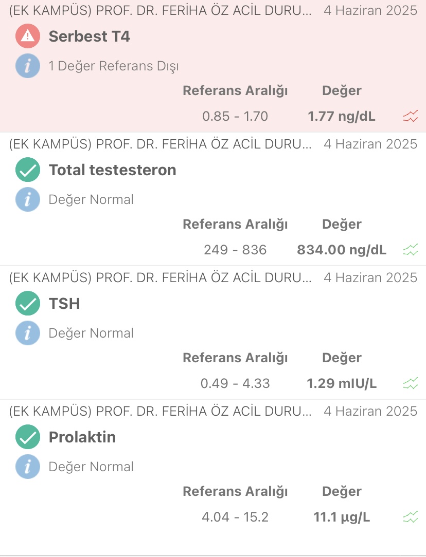 FSH: 1.13 LH: 2.03 E2: 9.6 Total Testosteron: 223 TSH: 1.79 Serbest T3: 3.04 Serbest T4: 1.19 Prolaktin: 6 Merak ettiğim birkaç konu var:
